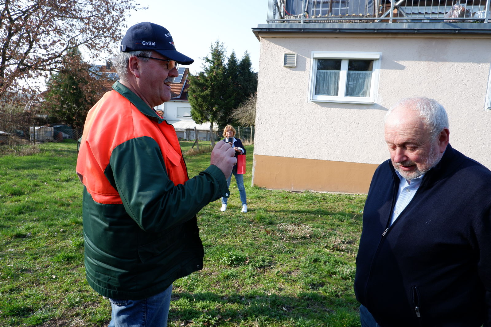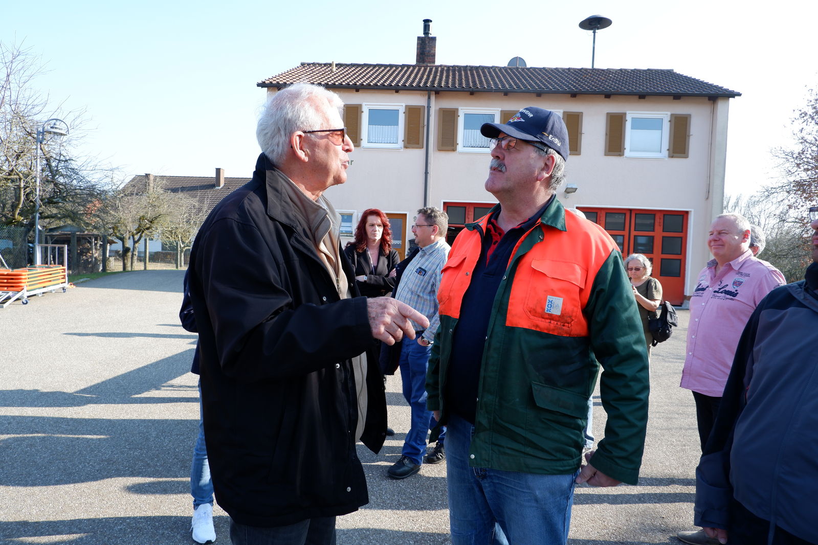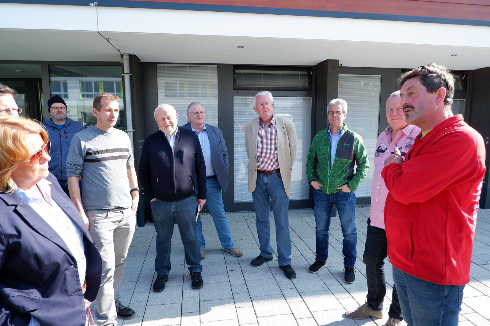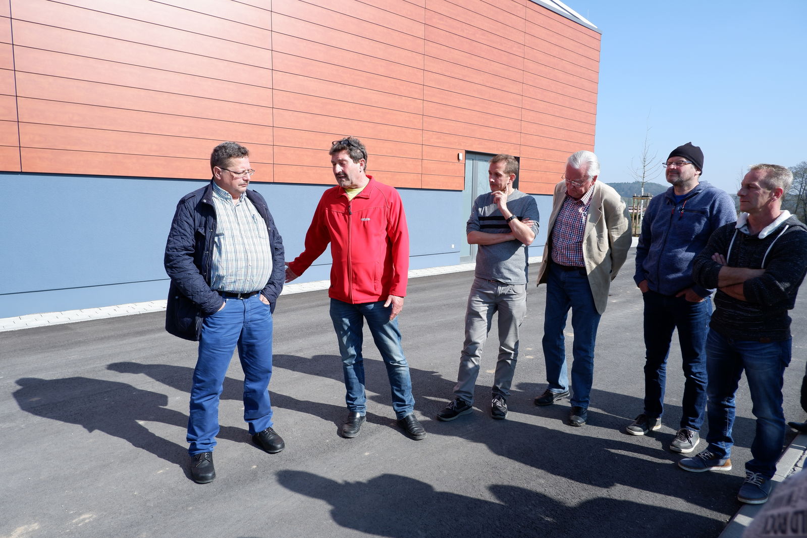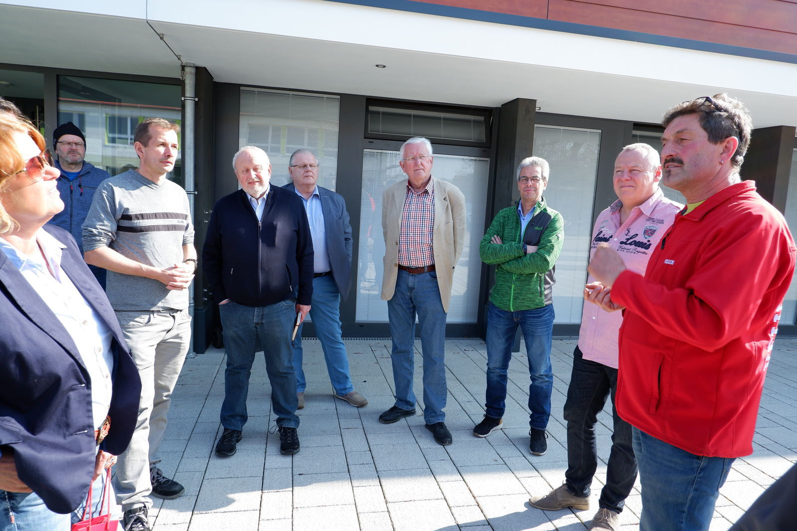 Das erste Treffen mit Ortsvorsteher Horst Philipp und den beiden Ortschaftsräten Meiser und Zeller fand vor der neuen Halle in Jagstheim statt. Die drei Jagstheimer zeigten sich sehr zufrieden mit ihrer „Jagstauenhalle“, wobei Ortsvorsteher Philipp zu verstehen gab, dass das Ganze auch billiger hätte gebaut werden können. Die Veränderungen im Kindergartenbereich, Umzug in neue Räume in der alten Schule sowie die neuen Räume für Ortschaftsrat und Ortsvorsteher wurden begrüßt.