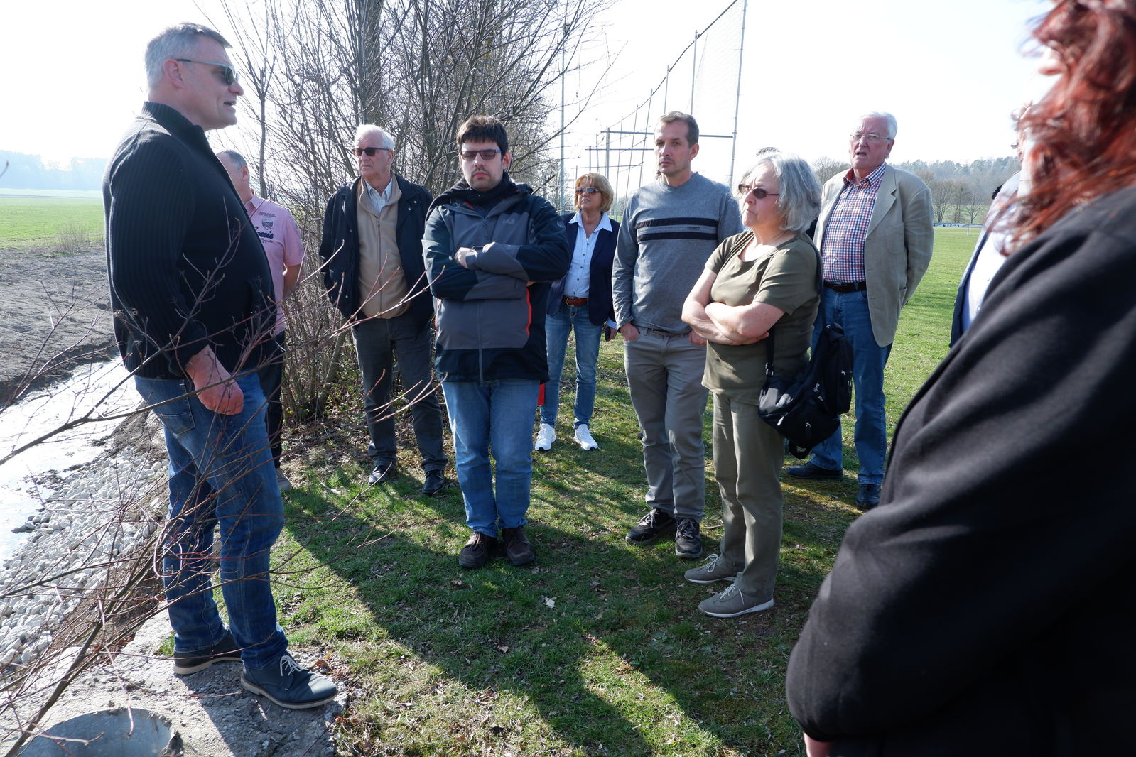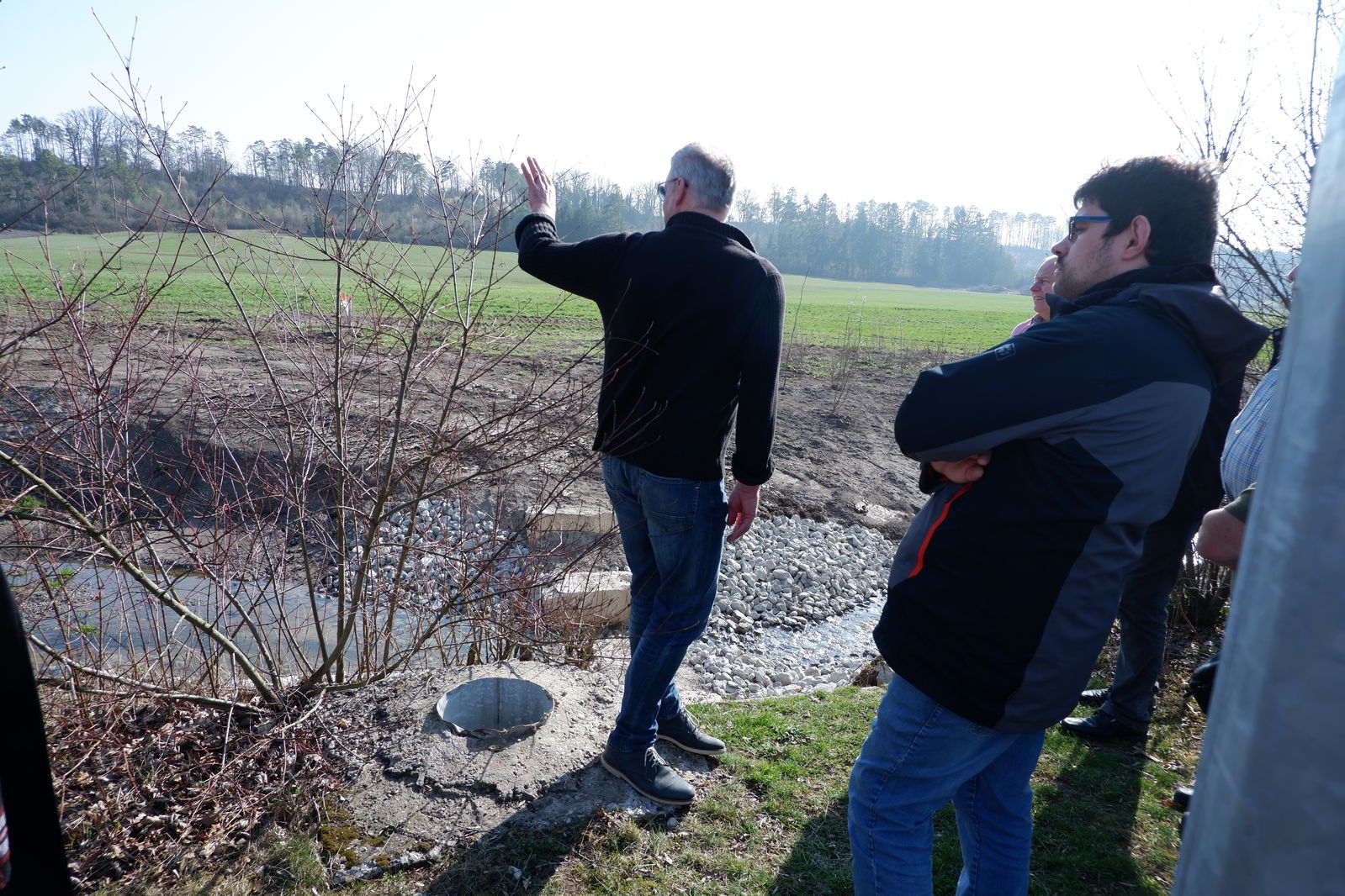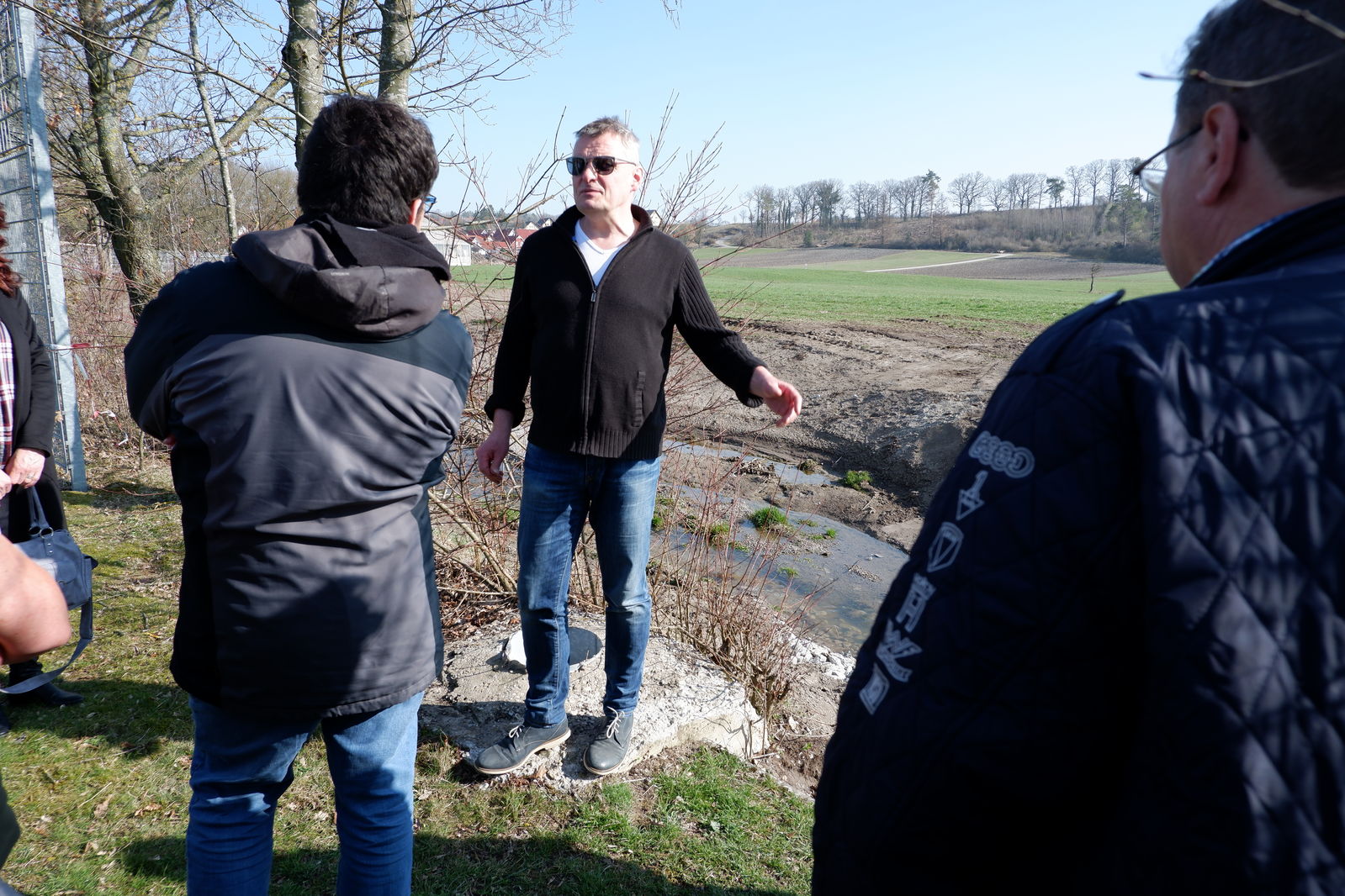 In Westgartshausen traf man sich mit Ortsvorsteher Hermann Wagner am erfolgreich renaturierten Bach. Wagner stellte das neue Baugebiet in unmittelbarer Nähe des Bachverlaufs vor, sprach über Hochwasserprobleme und die Problematik innerörtlichen Baupotenzials, das nicht zur Verfügung gestellt wird. Mit eine Ursache für großen Flächenverbrauch! Auf Nachfrage kam auch noch einmal die andiskutierte Verlegung des RFC nach Westgartshausen und die dann folgende Entscheidung für Tiefenbach zur Sprache.