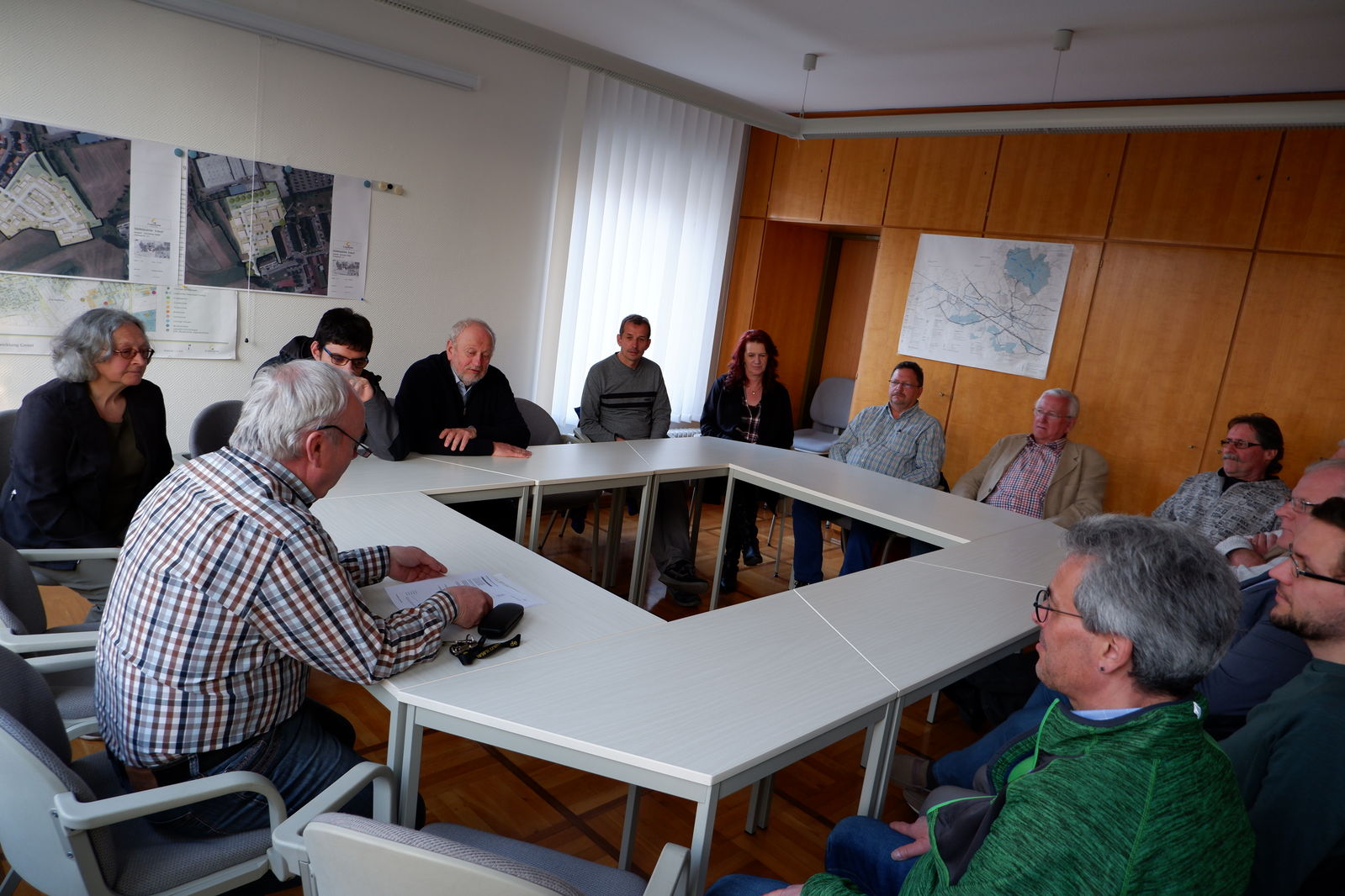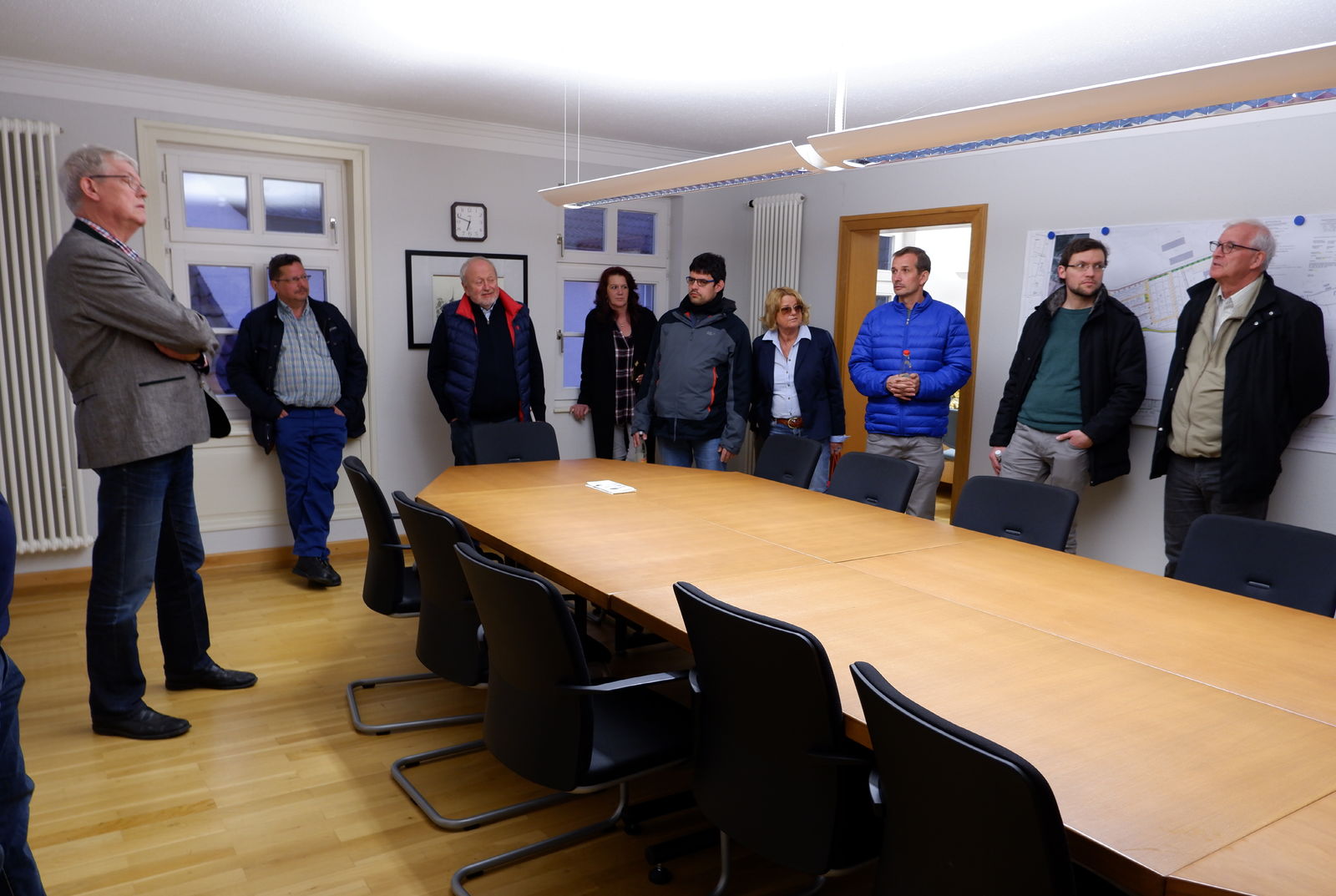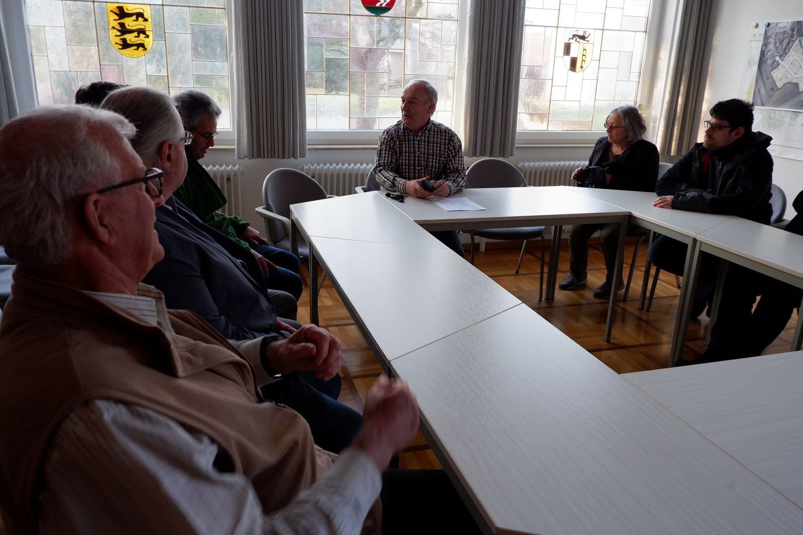 Das nächste Ziel wäre dann Rossfeld. Hier wartete Ortsvorsteher Hartmut Werny. Im Sitzungssaal des ehemaligen Rathauses ging er auf die Situation in Rossfeld ein. Drei Themen standen dabei im Zentrum seiner Ausführungen. Er stellte die beiden neuen Baugebiete vor, zeigte deren Lage und betonte ihre Notwendigkeit. Das für Rossfeld daneben besonders wichtige Thema Verkehr im Zusammenhang mit im sog. Härtle entstehenden neuen Gewerbegebiet, mit dem sich sowohl Rossfelder wie auch Tiefenbacher auseinandersetzen müssen, lag ihm besonders am Herzen. Mit den SPD KandidatInnen war er sich einig, dass die Nutzung weiterer Flächen für Gewerbeansiedlungen nur in Verbindung mit dringend notwendigen Verkehrslösungen möglich sein dürfen. Zum Schluss