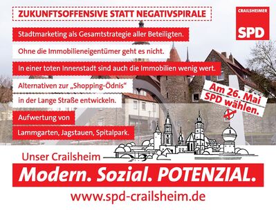In weniger als sechs Wochen findet die Kommunalwahl auch in Crailsheim statt. Wir schalten jeden Donnerstag eine Anzeige im Crailsheimer Stadtblatt, um über unsere Positionen zu informieren. Die Anzeige der kommenden Woche hat das Thema "Zukunftsoffensive für Crailsheim" zur Grundlage!